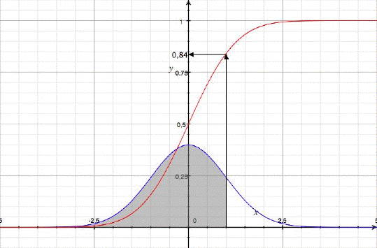 Der rote Graph ist P(x≤k), wobei hier der Wert für k=1 eingezeichnet wurde. Sie entspricht der Verteilungsfunktion F(X)=P(X≤k). Der blaue Graph ist die Dichtefunktion f(X).