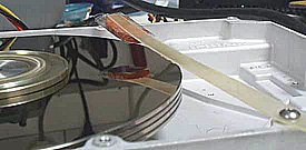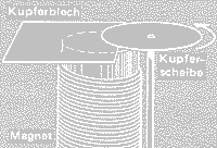 Eine drehbar gelagerte Kupferscheibe vor einem mit Wechselstrom betriebenen Elektromagneten wird abgestoßen, dreht sich aber nicht. Wird ein Kupferblech dazwischen geschoben, beginnt die Scheibe zu rotieren. Das magnetische Wechselfeld erzeugt im Blech und in der Scheibe einen Strom, dessen Magnetfeld dem des Magneten entgegengesetzt ist. Im nicht abgeschirmten Bereich der Scheibe entsteht zum Kupferblech eine Anziehung: die Scheibe rotiert. |