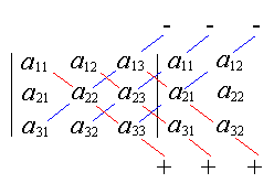 det(A) = a11·a22·a33 + a12·a23·a31 + a13·a21·a32 - a31·a22·a13 - a32·a23·a11 - a33·a21·a12